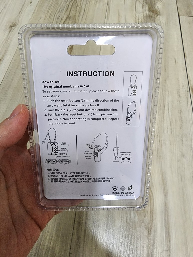 TSA 자물쇠 포장의 뒷모습입니다. 자물쇠 암호를 세팅하는 방법이 기재되어 있습니다: