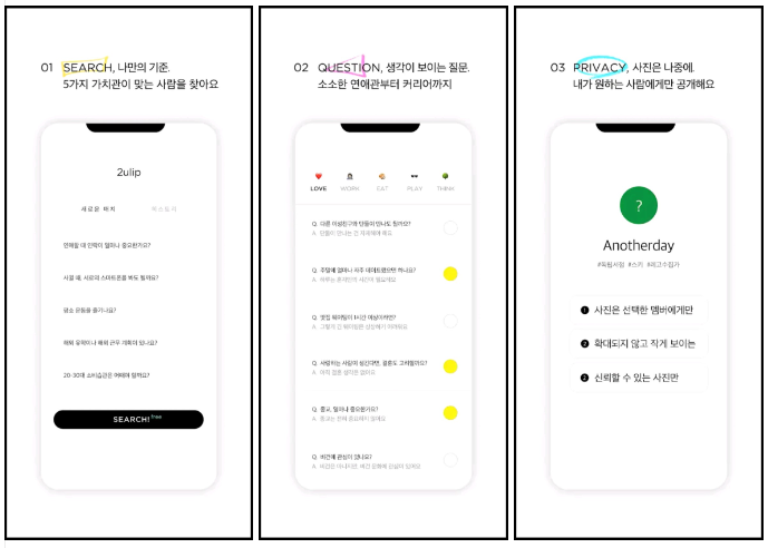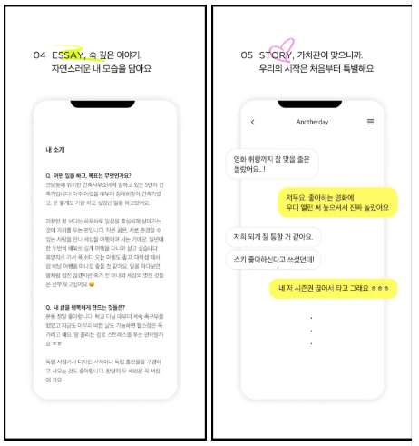 반면 튤립은 외모만을 보고 상대방을 판단하는 소개팅 앱이 아니고, 어플에서 가치관을 가늠할 수 있는 시스템들이 포함되어 있습니다. 그리고 소개팅 어플이지만 비교적 길게 글을 쓸 수 있는 ESSAY 항목도 있습니다. 필자의 회사 동료와 튤립 가치관 소개팅 앱에 대해 이야기하다가 본 글쓰기 대목에서 공감대가 형성이 되었습니다. 예컨대 특정 사람의 글을 보면 그 사람의 결이 보인다는 부분에 있어서 공감했지요.