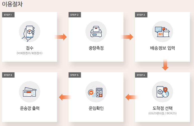 : 접수 -> 택배 무게 측정 -> 상품 종류 선정 -> 파손 우려 유무 선택 -> 물품 가액 입력 -> 구매자 배송정보 입력(상대측 GS25) -> 배송일 안내 확인 후 운송장 출력 -> 보낼 상품에 운송장 붙이기(판매자 보관용은 개별 보관) -> 카운터에서 택배비 결제 진행