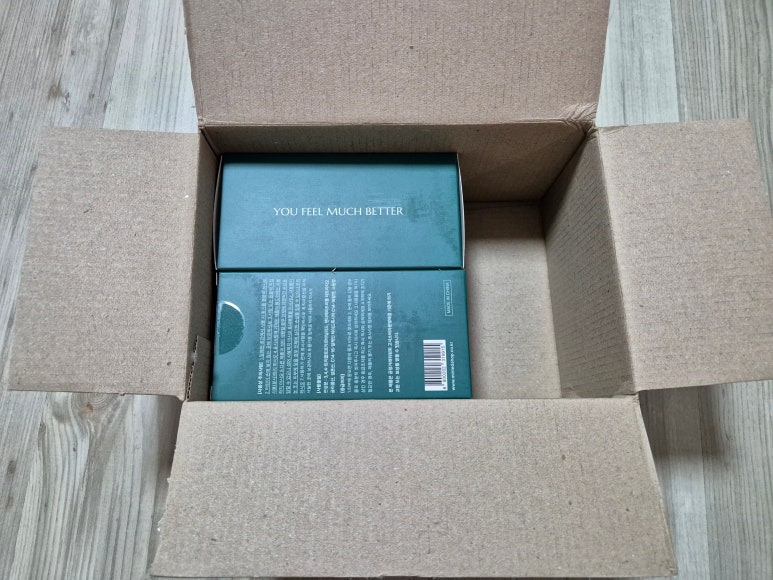 택배 박스를 열어보았습니다. 녹색 민티드 상품 박스가 있습니다.