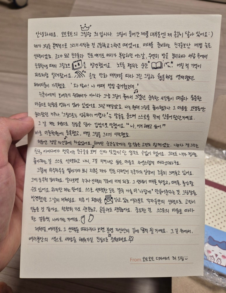 모트모트 편지는 노트 위에 자필로 쓴 것 같은 스타일로 프린트한 종이입니다.