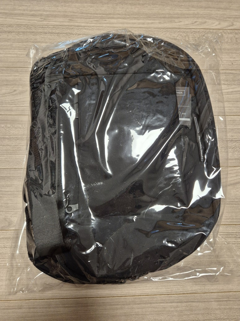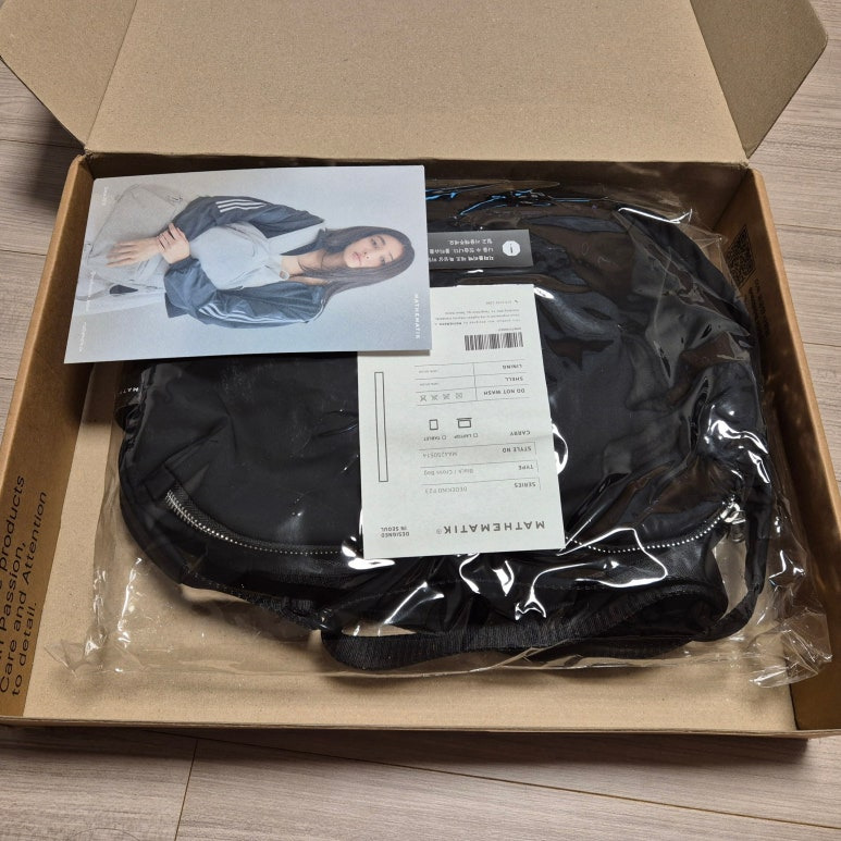 택배 상자를 열어 보았습니다. 투명 비닐 안에 가방이 들어 있습니다.