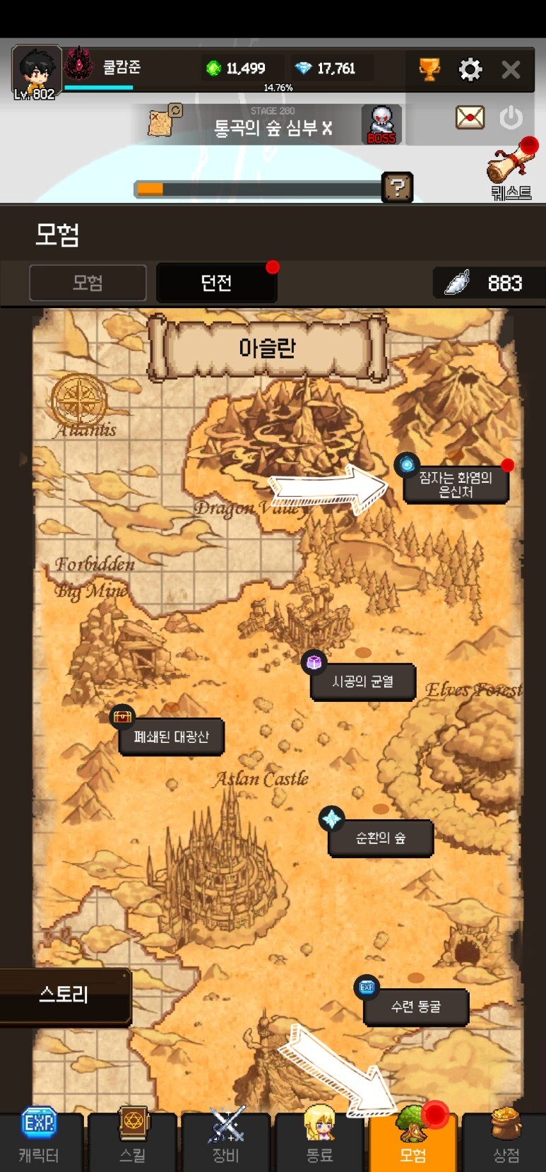 하단에 "모험"을 누르고 "잠자는 화염의 은신처"를 누릅니다.